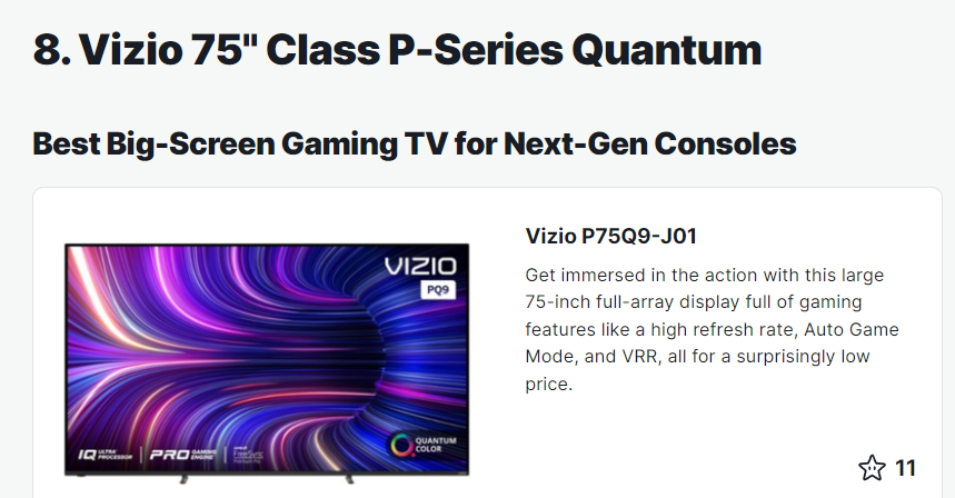 8、8. Vizio 75英寸P系列电视——适用于下一代游戏机的最佳大屏幕游戏电视