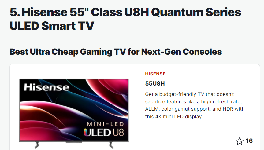 5、海信55寸U8H量子系列ULED智能电视——适用于下一代游戏机的最佳超便宜游戏电视