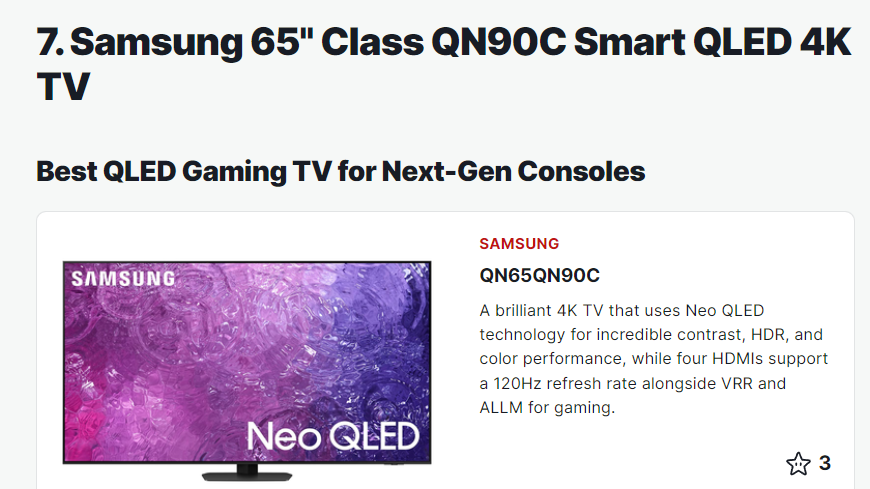 7、三星65英寸QN90C智能QLED 4K电视——适用于下一代游戏机的最佳 QLED 游戏电视