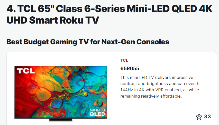 4、TCL 65英寸6级系列Mini-LED QLED 4K超高清智能Roku电视——适用于下一代游戏机的最佳预算游戏电视
