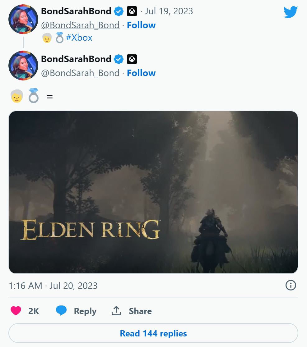微软可能在暗示《艾尔登法环》即将登陆Xbox Game Pass。7月19日微软Xbox游戏创作者体验和生态系统副总裁Sarah Bond发布了一个神秘推文,由老人表情+戒指+Xbox标签组成。随后她又发布了一张《艾尔登法环》的截图。