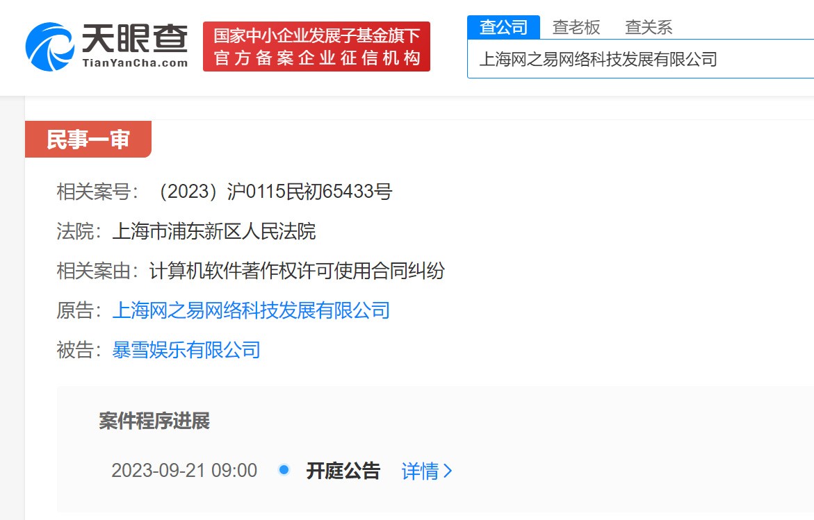 近日据天眼查App数据显示,上海网之易网络科技发展有限公司与暴雪娱乐有限公司的计算机软件著作权许可使用合同纠纷案件新增开庭公告,原告为上海网之易,案件将于9月21日在上海市浦东新区人民法院开庭审理。