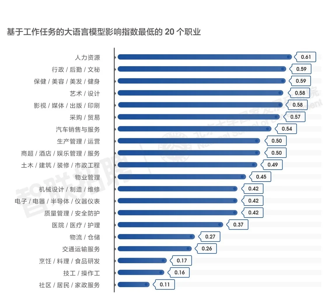 影响指数最低的20个职业包括社区/居民/家政服务、技工/操作工、烹饪/料理/食品研发、交通运输服务、物流/仓储、医院/医疗/护理等,其“基于工作任务的大语言模型影响指数”(Work Activity-based LLM Exposure Index)分别为0.11、0.16、0.17、0.26、0.27、0.37。这些职业的共同特点在于,工作任务包含较多的体力劳动,并且需要在直接与人打交道的过程中提供服务。值得注意的是,尽管这些职业受到大语言人工智能的影响较小,但是其受到机器人等其他数字技术的影响较大。评估职业的可替代性和未来的发展前景,还需要结合不同技术的发展综合评判。