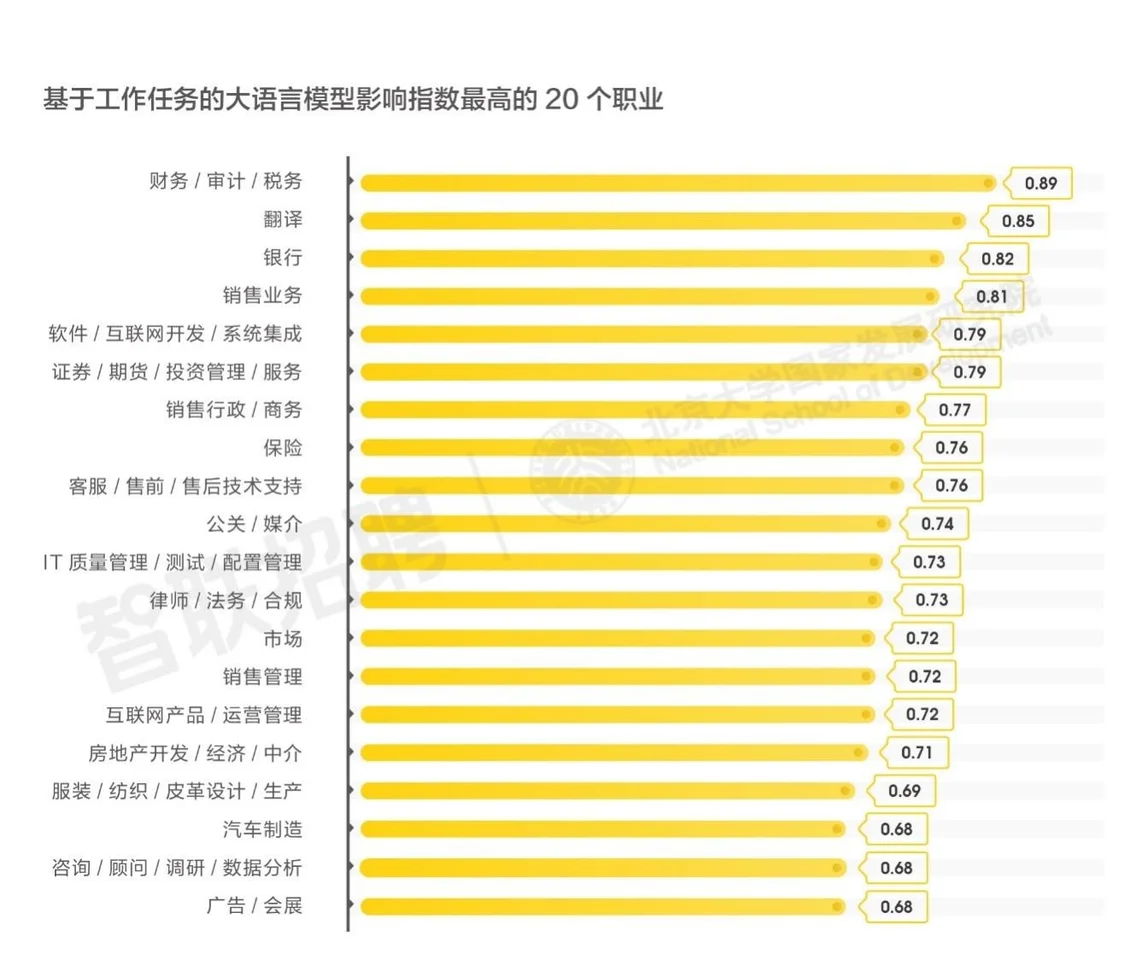 近日,北大国发院联合智联招聘发布《ChatGPT如何影响我们的工作?——AI大模型对我国劳动力市场潜在影响研究》,通过对招聘岗位工作任务的文本分析,首次构建了各种职业的人工智能影响指数。根据智联招聘发布的各种职业的岗位需求对工作任务的描述,20个职业更可能被以ChatGPT为代表的大语言模型人工智能技术进步所影响,其中包括财务/审计/税务、翻译、银行、销售业务等。