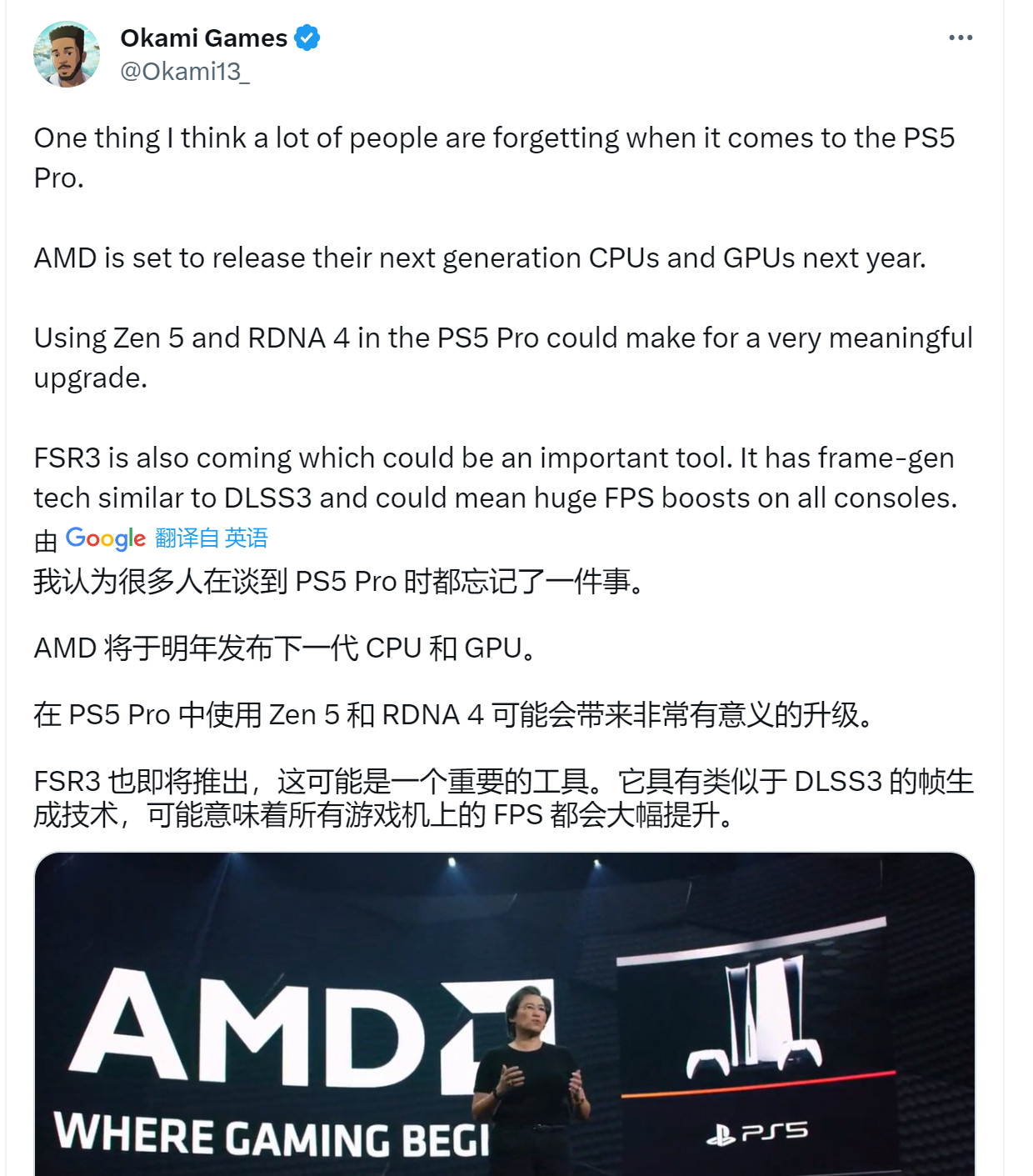 推主Okami Games认为PS5 Pro极有可能存在,而且会使用AMD下一代CPU(锐龙5)和GPU(RDNA 4架构)组合,加上可能的FSR3