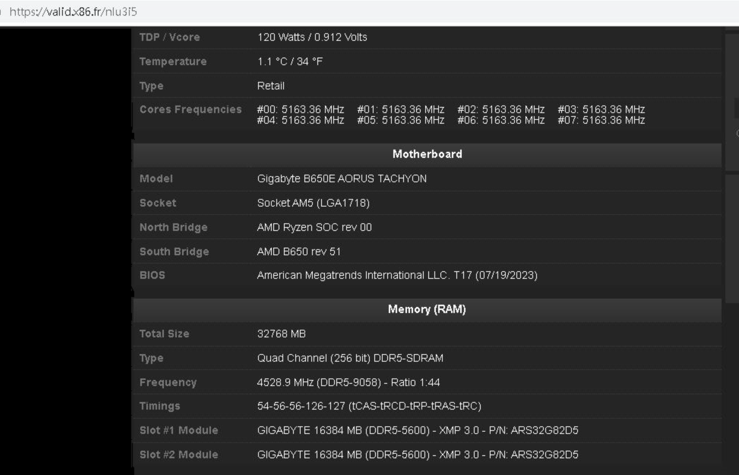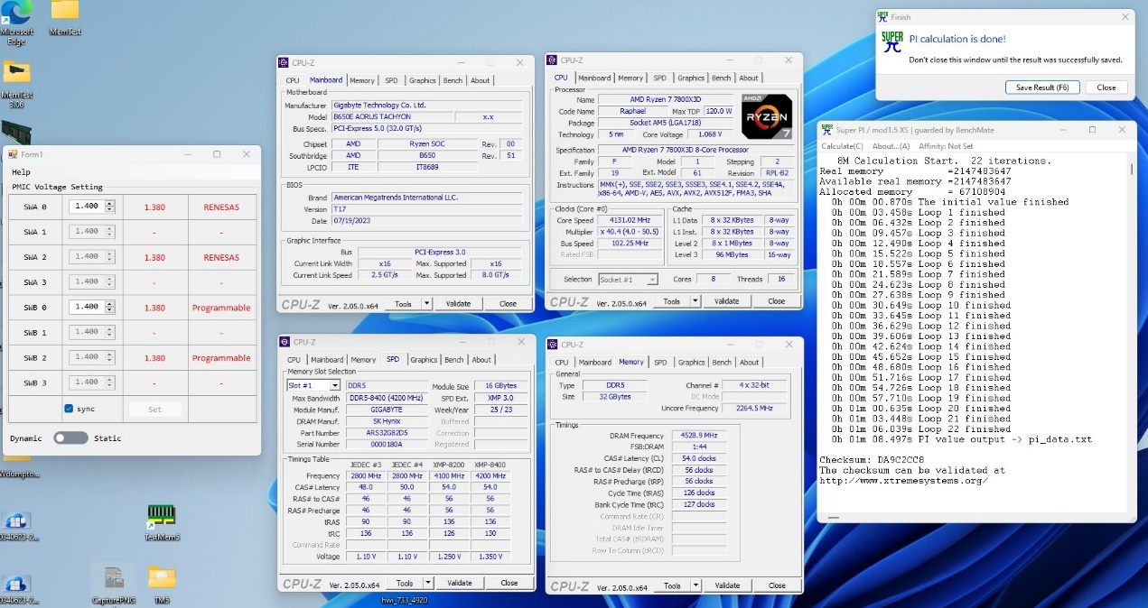这几天已经有很多人试过了AMD平台实现DDR5-8000的能力,但这不是终点,超频高玩HiCookie在锐龙7 7800X3D及技嘉B650E Aorus Tacyon主板上实现了9058MHz的频率(XMP默认是8400),轻松超过9GHz。