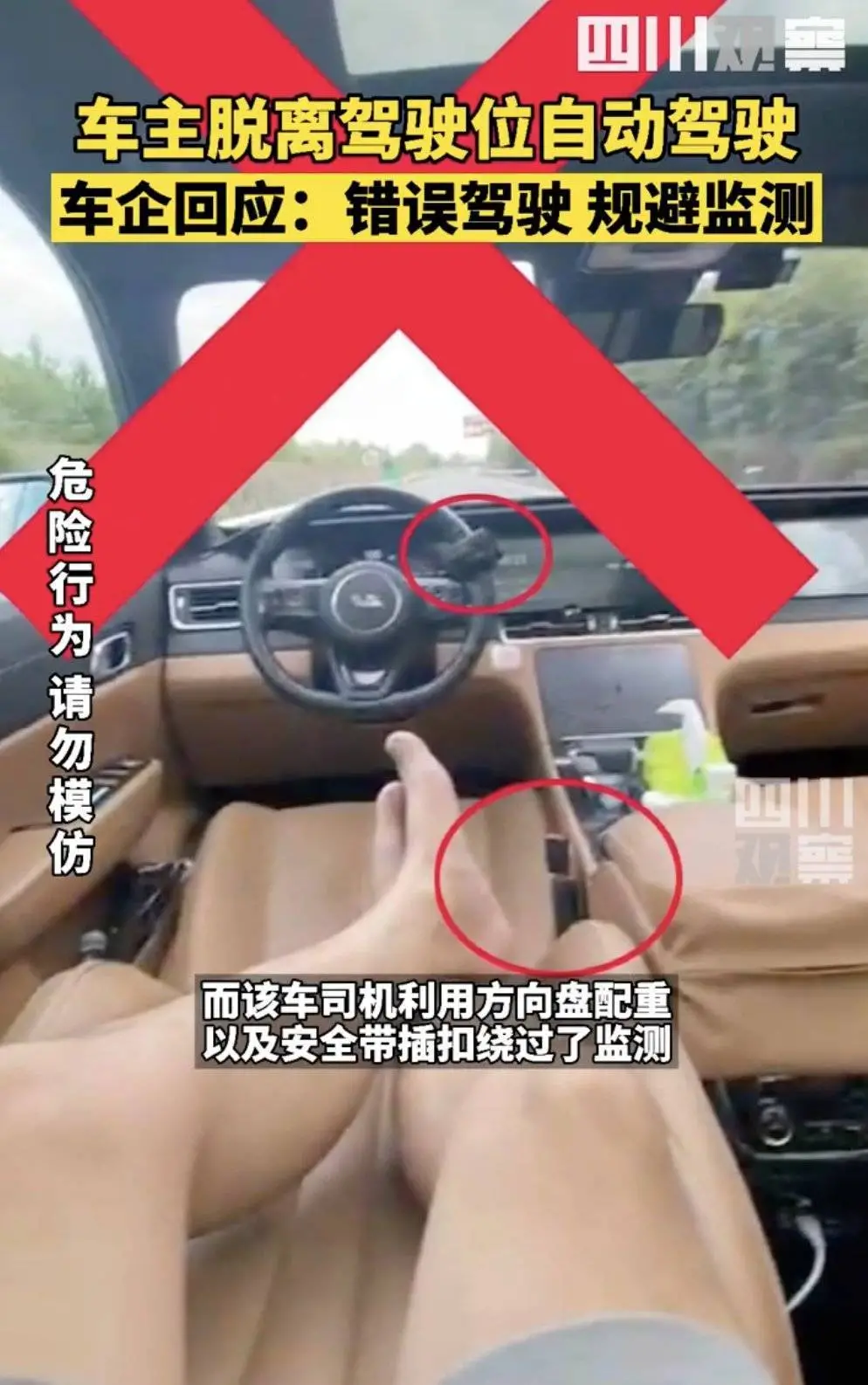 在上图描述的事件中,车主使用了一个套在方向盘上的配重块,忽悠了理想ONE的握力传感器。配合一个安全带插扣,他/她成功让车辆以为自己还在双手紧握方向盘,双眼目视前方驾驶车辆,而自己实则安然将座椅放成平躺角度,坐在后排享受人生。