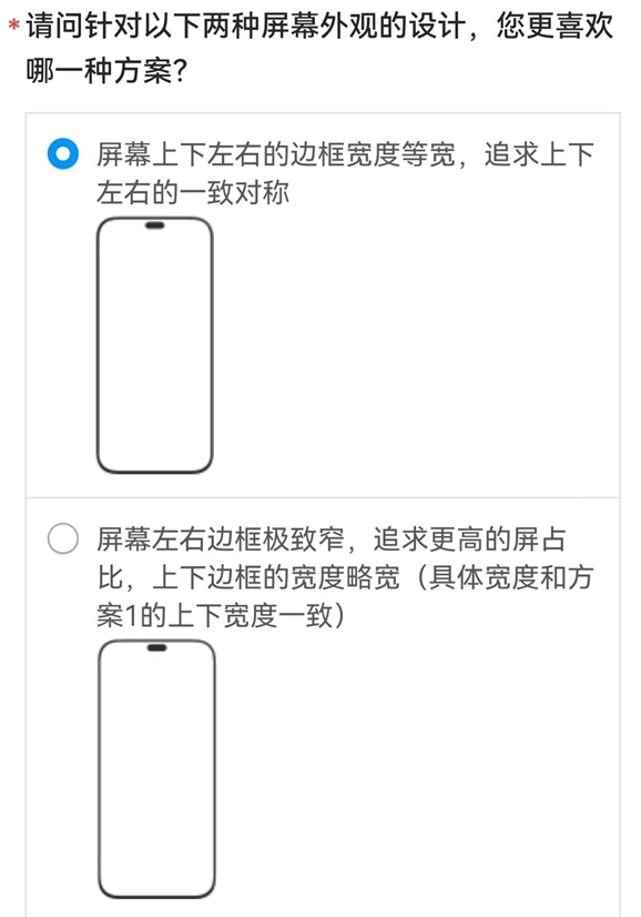 另外,华为此前也做过调研,在调研中,华为提供了两种“灵动岛”方案,一种是“四边等宽”,一种是“左右两边极窄”,似乎是在为华为Mate 60系列埋下伏笔。