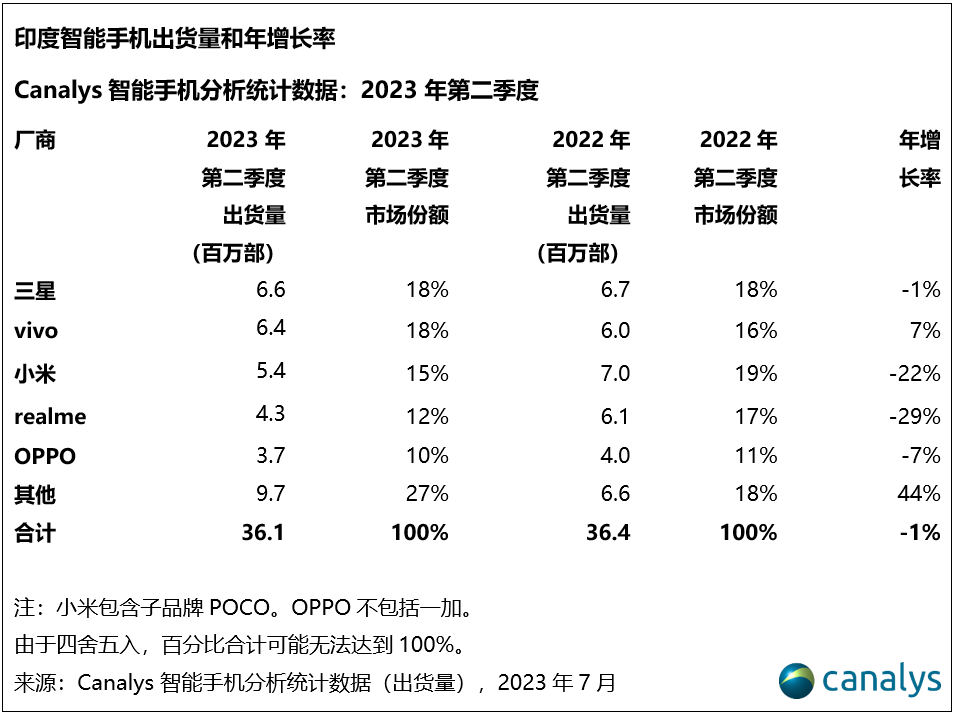 近日,Canalys发布的一份数据报告显示,2023年第二季度,印度智能手机市场表现坚挺,出货量稳定在3610万部,同比仅下降1%。标志着在经历连续三个季度下滑后,出现轻微复苏的信号。随着厂商的库存水平逐渐转好以及有力的商业环境,当地市场环比增长18%。