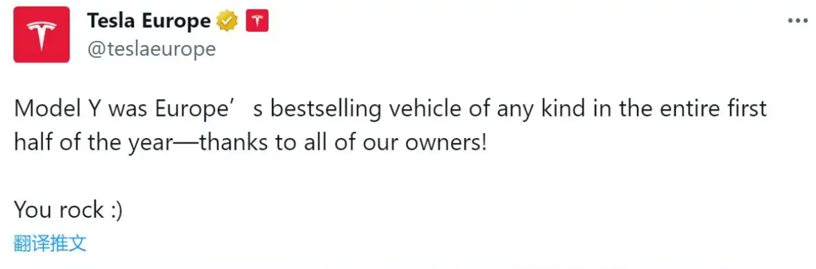 而特斯拉欧洲的官方账号发布消息:“特斯拉 Model Y 是上半年欧洲全品类销量最高车型”。