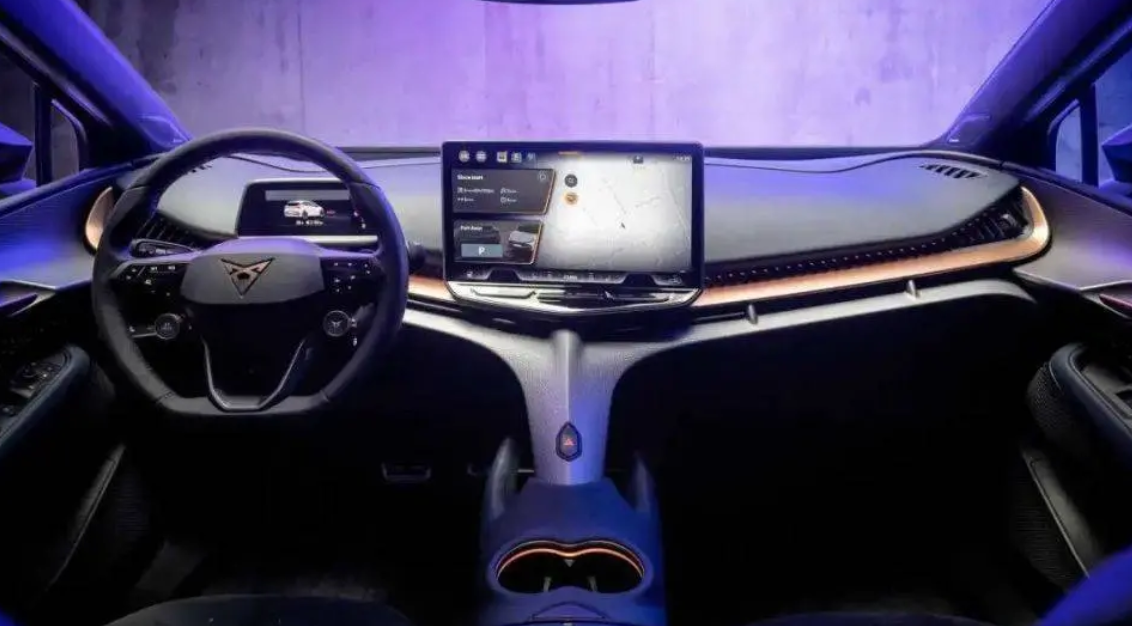 内饰方面,Cupra Tavascan采用大量的弧线和异形面板来营造运动氛围,同时还采用玫瑰金和哑光银元素进行点缀。 新车内饰取消了不少物理按键,可以看到的物理按键为多功能方向盘上,和双闪开关。