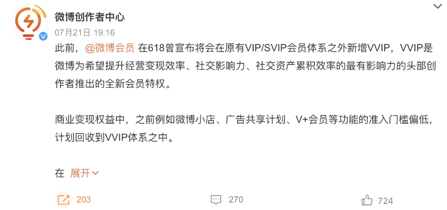 近日,微博创作者中心官方发布消息,宣布将在原有的VIP/SVIP体系外,新增VVIP体系。新的VVIP将整合此前诸如微博小店、广告共享计划、V+会员等功能。根据微博介绍,新的VVIP体系将结局解决微博V认证体系中存在的认证信息与实际情况不符、认证信息未及时更新、一些临时活动认证长期存在等问题。
