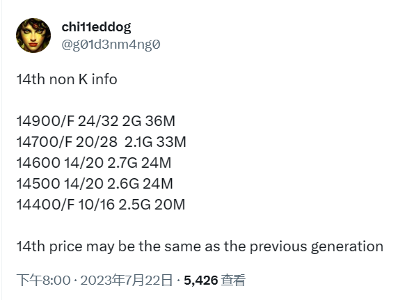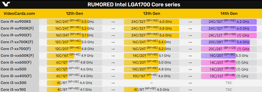 根据最新的曝料,i5-14600/14500系列都会停留在6+8 14核心,i5-14400系列则停留在6+4 10核心,没有任何变化。