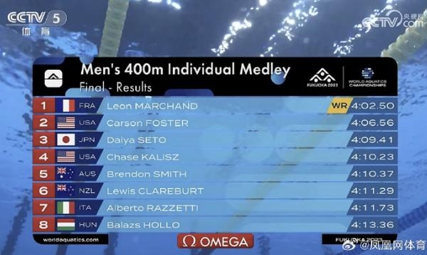 23日,在福冈游泳世锦赛中,21岁的法国选手马尔尚打破了菲尔普斯在2008年北京奥运会创造的男子400米混合泳世界纪录。在福冈游泳世锦赛中,法国选手马尔尚打破了菲尔普斯在2008年北京奥运会创造的男子400米混合泳世界纪录,新纪录为4分02秒50。