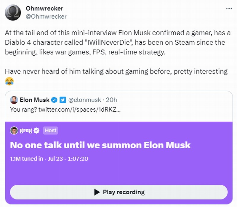 近日推特网友Ohmwrecker发推文称,最近特斯拉CEO马斯克参加了一档语音访谈节目,他说自己是一位热爱游戏的玩家。马斯克表示自己最近在玩暴雪的《暗黑破坏神4》,自己的ID叫做“永远不死(IWillNeverDie)”,有玩家笑称不知他是否能在硬核模式中做到永远不死。