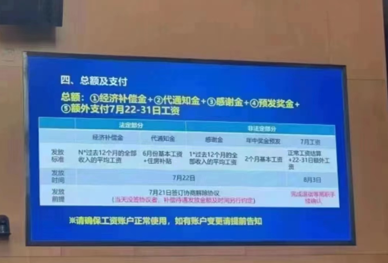 不过,补偿金发放前提为在7月21日签订协商解除协议,并在8月3日前完成退宿等离职手续确认。