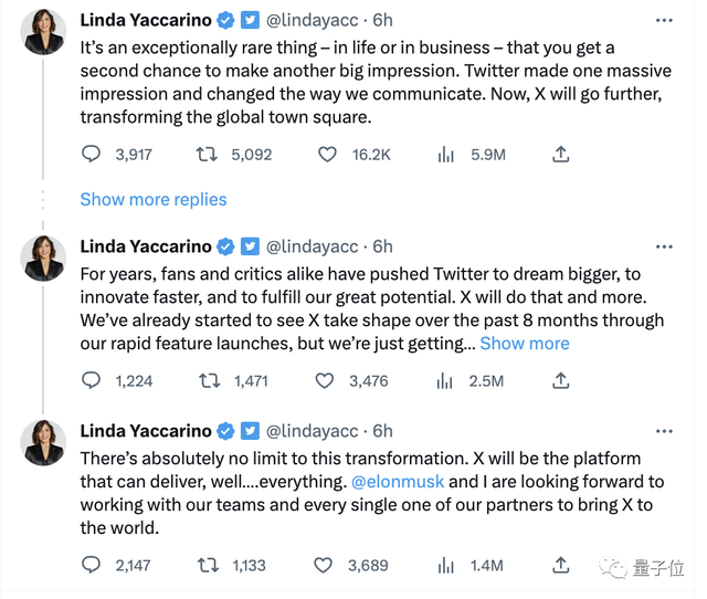 推特新任首席执行官Linda Yaccarino也连发多条推文,并透露了X的未来形态和具体举措。