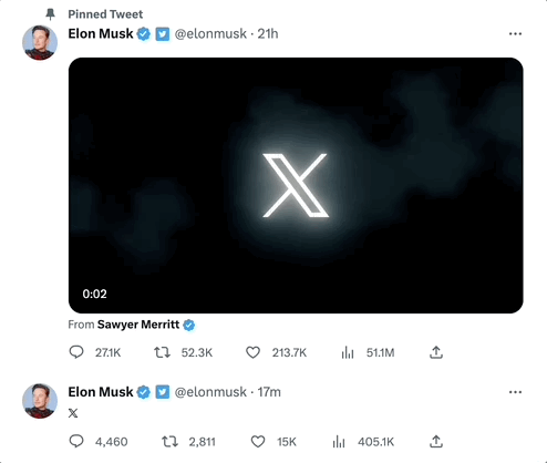 随后他又连发多条推文,比如,可能会像这样——X Logo放在黑色背景上。