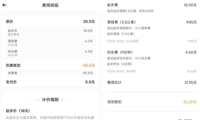 价格方面,“科技新知”选择在两家平台各打车一次,其中小马智行打车2.4公里,费用30.5元优惠抵扣后实付0元;萝卜快跑打车3.5公里,费用31.95元,活动抵扣后实付5.75元。
