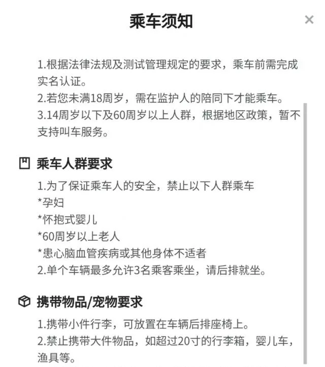 打开APP,你会看到无人驾驶平台的乘车须知。与常规的网约车相比,无人驾驶没有什么特殊之处,只有一点例外——一辆车最多乘坐3人,乘客只允许坐在后排。