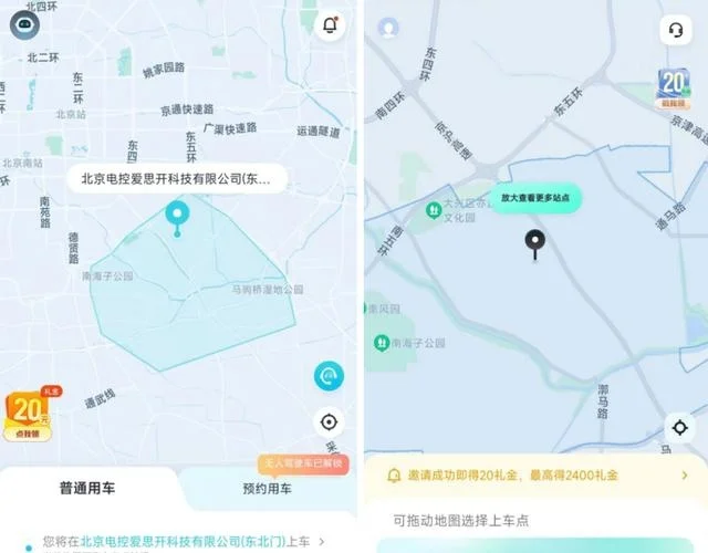用户完成注册后,就可以选择出发点和目的地。在出发前,“科技新知”在亦庄随意选取了两个地点,两个平台立即给出了接单车辆位置,车辆信息显示,接单车辆赶到目标地点在3分钟左右。