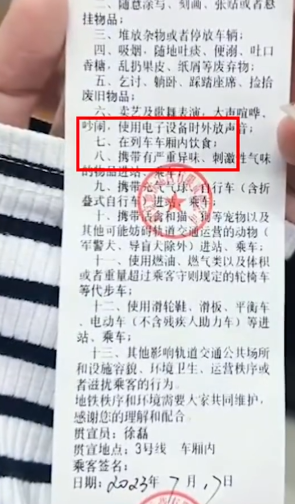 据悉,南京地铁算是国内对违规行为处罚较为严格的地铁线路之一,按照南京地铁新条例,在地铁车厢内吃东西要被“警告或者罚款20到100元”。