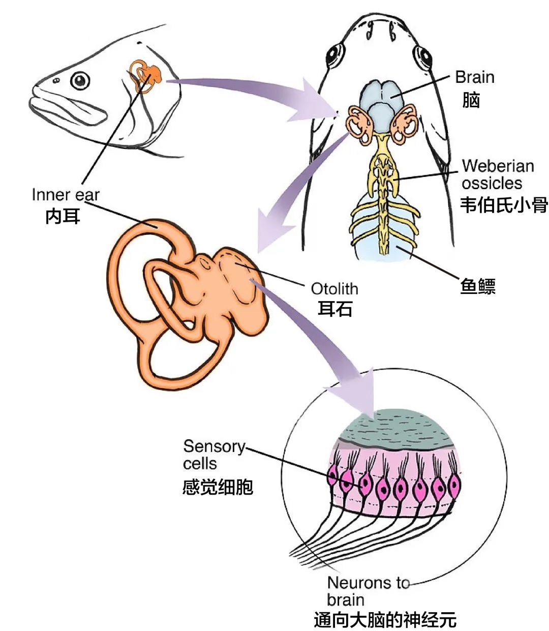 鱼类内耳的功能和人类一样,一是收听声音,二是维持身体平衡(是的,人类的内耳也能维持身体平衡)。