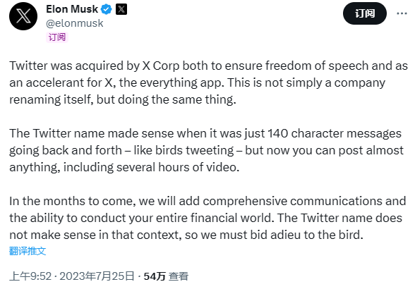 在此之前,马斯克就曾表示,希望将推特变成“X”,一个集音频、视频、信息、支付和银行服务于一体,如同微信般无所不能的App。