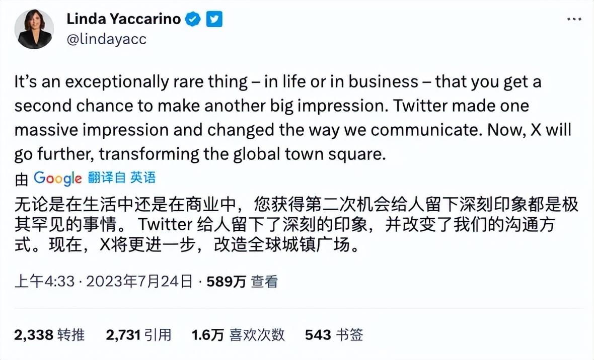 用Twitter新CEO Linda Yaccarino的话来讲:在生活中或商业中,我们都很难得到第二次机会给别人留下深刻印象。Twitter曾经做到了第一次。而现在,X就要做到第二次,变成一个改变全球的城市广场。