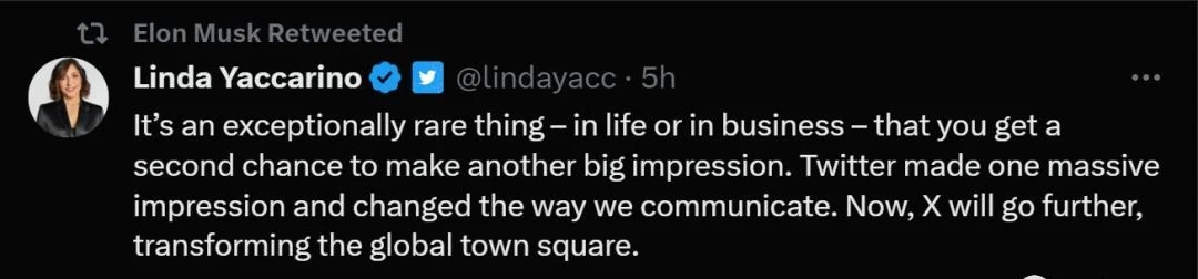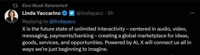 与此同时,Twitter新任CEO Linda Yaccarino也正式宣布:“X是无限交互的未来形态——以音频、视频、消息、支付/银行为中心——创建一个创意、商品、服务和机会的全球市场。在人工智能的支持下,X将会连接我们所有人,在这方面,我们才刚刚处于想象的起点。”