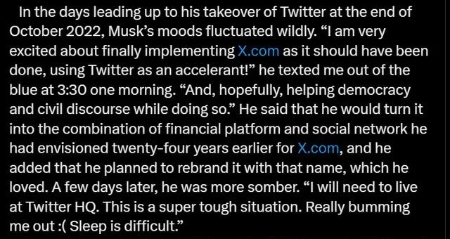在2022年10月底接管Twitter之前的几天里,马斯克的情绪波动很大。一天早上3点30分,他突然给我发了短信,“我非常兴奋,因为我终于可以用Twitter作为助推器,按部就班地实施X.com了。而且,希望在这样做的同时,还能帮助民主和文明对话”。他说,他会把Twitter变成24年前为X.com设想的金融和社交网络的结合体。他补充道,他计划用他喜欢的那个名字重新命名Twitter。几天后,他情绪更加低落了。“我需要住在Twitter总部。这是一个非常艰难的情况。真的让我很沮丧,睡眠很困难。”