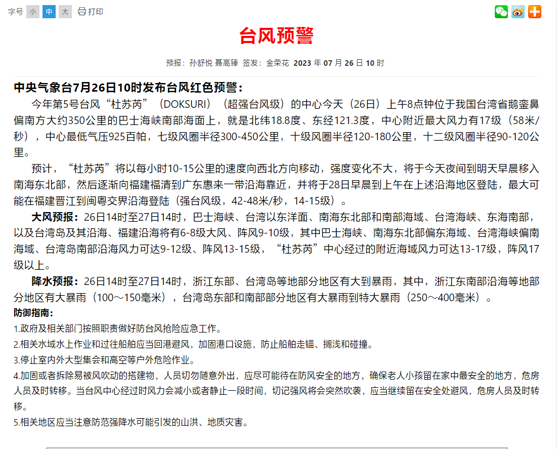 中央气象台7月26日10时发布台风红色预警:今年第5号台风“杜苏芮”(DOKSURI)(超强台风级)的中心今天(26日)上午8点钟位于我国台湾省鹅銮鼻偏南方大约350公里的巴士海峡南部海面上,就是北纬18.8度、东经121.3度。