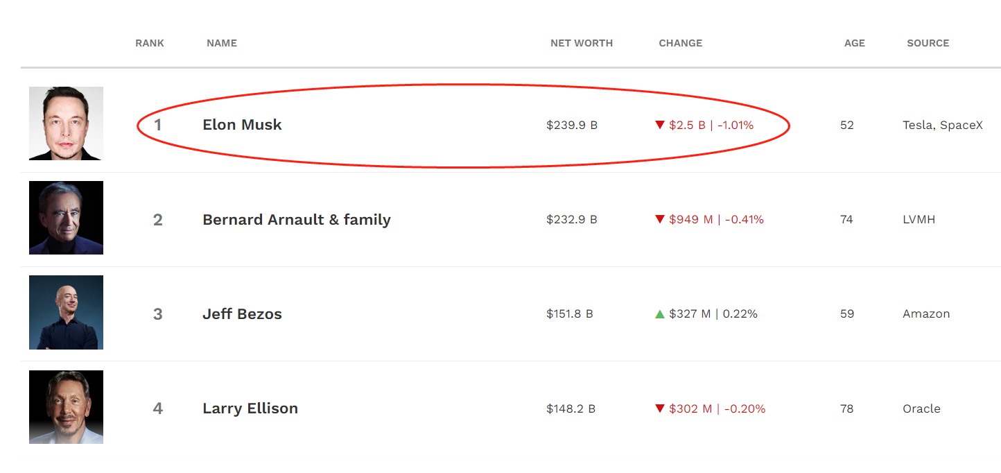 福布斯实时富豪榜显示,52岁的马斯克反超LV老板伯纳德·阿尔诺,重回世界首富宝座。截稿前,马斯克身价达到2399亿美元,排名全球第一。LV老板伯纳德·阿尔诺身价2329亿美元,紧随其后。今年4月份,福布斯发布了2023全球亿万富豪榜。现年74岁的LV老板伯纳德·阿尔诺超越马斯克,成为新全球首富。