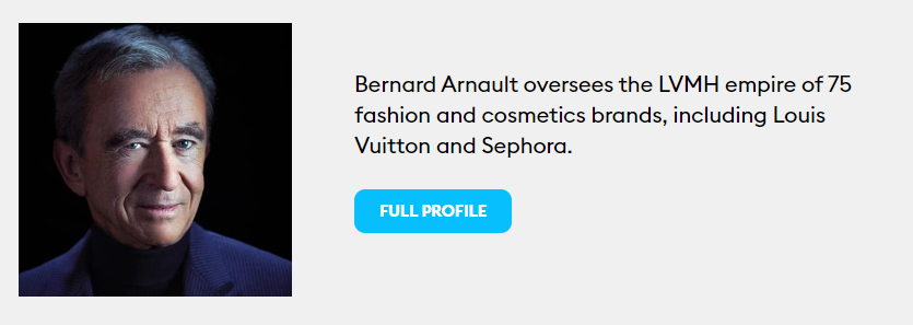 该集团旗下有着让全球女性为之痴迷的路易威登(LV)、迪奥和蒂芙尼等品牌,其收入、利润和股价在去年都创下了历史新高,使得阿尔诺的财富在过去12个月里增加了530亿美元,是所有富豪当中增额最多的。