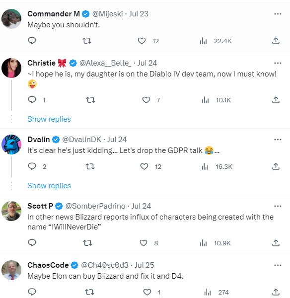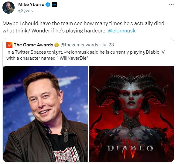 之前特斯拉CEO马斯克参加访谈节目,称自己是一位热爱游戏的玩家。他说自己最近在玩《暗黑破坏神4》,ID叫做“永远不死(IWillNeverDie)”。暴雪总裁Mike Ybarra也看到了这条消息,他发推文开玩笑说:“也许我应该让团队查下,看看马斯克的角色到底死了多少次?不知道他是否在玩硬核模式。”