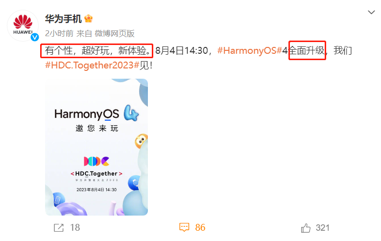 靴子落地!华为今日正式宣布,鸿蒙4.0将于8月4日在华为开发者大会正式亮相。华为官微在预热贴中给了三个关键词“有个性,超好玩,新体验”,加上“全面升级”的描述,不难猜测鸿蒙4.0将从系统UI、性能、用户体验进行一次360度的全方位革新。