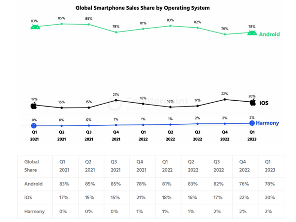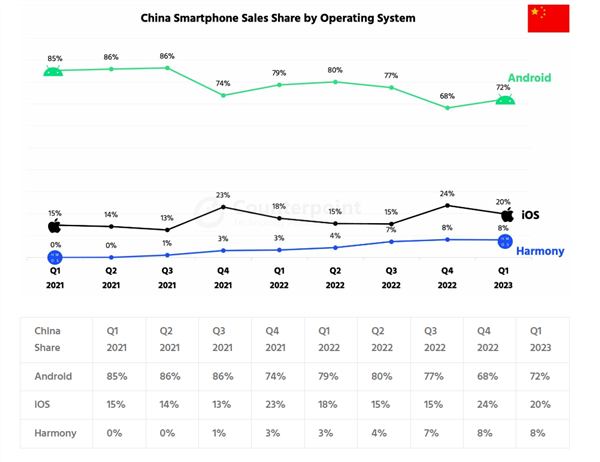 根据Counterpoint的最新数据报告,华为鸿蒙系统在中国的市场份额已经达到8%,成为安卓、iOS之后的第三大手机操作系统。