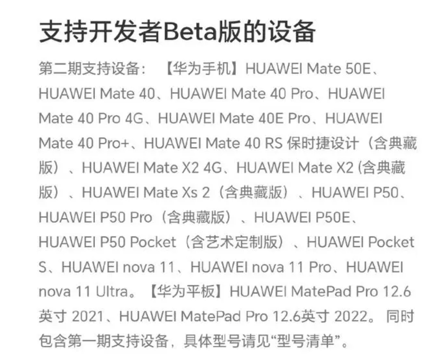 近日,华为又开启了第二批开发者Beta版招募,并新增包括华为Mate50E、华为Mate40系列、华为Mate X2系列等10余款测试机型。预计上述内测机型在鸿蒙4.0正式发布之后,也能第一时间尝鲜升级体验新系统。