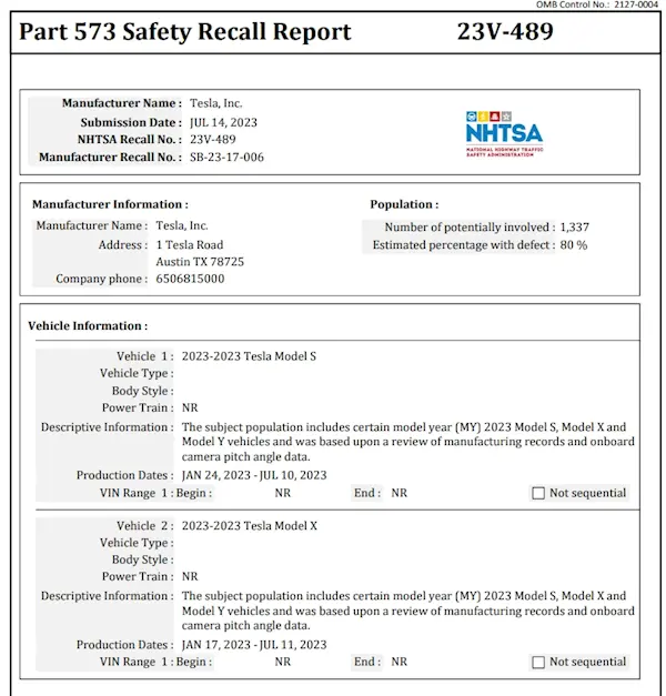 据NHTSA报告,此次总共有1337辆汽车可能受到影响,其中80%的车辆可能存在缺陷。
