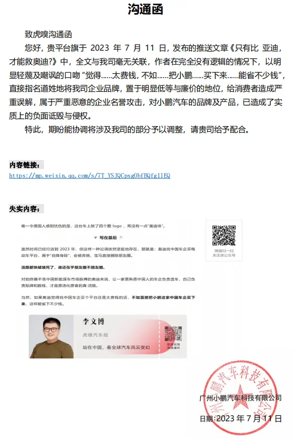 如果有一台德国品质 + 中国智慧的纯电车放在面前,你会动心吗?对不起,我知道你想动心,但先别动心,看完这个小插曲再决定:7 月 12 日,虎嗅收到一封来自小鹏汽车的沟通函。文中提到,虎嗅在前一天的推送文章《只有比亚迪,才能救奥迪?》中,建议在中国电动车市场玩不转的德国奥迪,直接收购中国小鹏,增强竞争力。