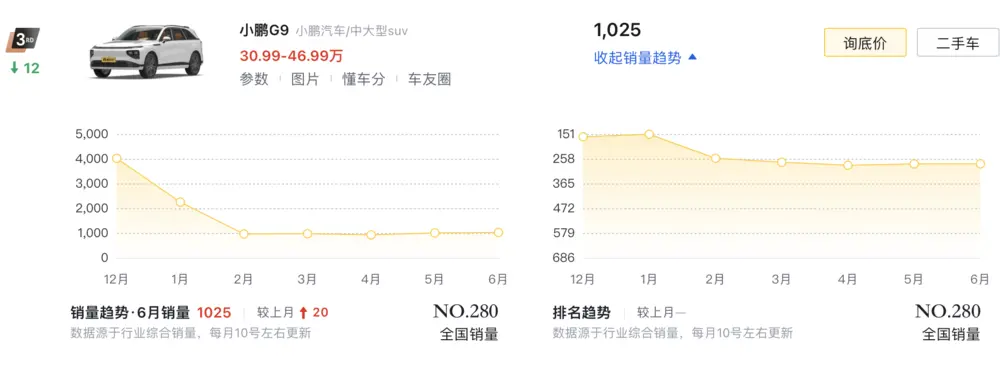 同时在承担品牌销量任务的G6和P7i方面,负责赚钱养家的这两款车同样表现不好。在过去的6月份,小鹏P7i加2022款小鹏P7一共才卖了5196台,而这已经是这两款车在今年以来销量的顶点。