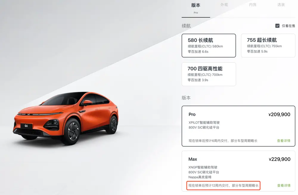 这其中的直接原因,便是这两款热销车型从下单到提车的时间实在太长,已经引发了消费者的观望情绪。根据小鹏汽车官网显示,G6的Pro版提车时间需要6周。而装配有激光雷达并能够实现城市NGP领航辅助驾驶的Max版,居然要等12周。也就是说如果今天下单小鹏G9 Max,你等到十一七天假期过完回来,都不一定能提车。