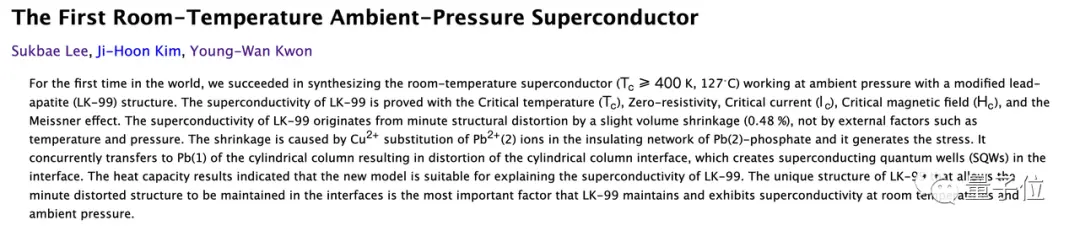 同一时间,团队里的“三位韩国本土学者”又单独发了篇论文,并用首个室温常压超导的词语来描述研究。