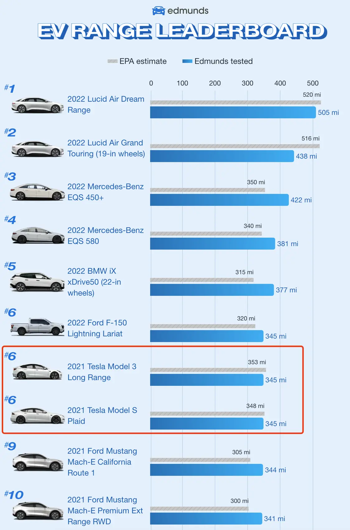 结果发现,特斯拉旗下5款车型8个版本的实际续航里程都没有达到它所宣传的指标,它们是2021款Model 3长续航版、2021款Model S Plaid、2020款Model S高性能版、2021款Model Y长续航版、2020款Model X长续航版、2020款Model Y高性能版、2018款Model 3高性能版、2020款Model 3标准续航增强版。