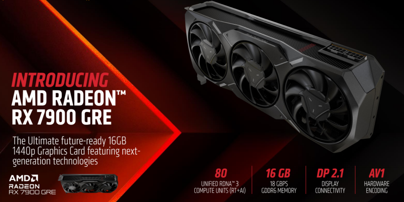 AMD今天正式发布了RDNA3家族的第四款显卡,非常特殊的一个型号,Radeon RX 7900 GRE。该卡在中国市场首发,是一款非常特殊的“中国特供”产品:在中国市场上以单卡的形式零售,在其他地区则以SI整机的形式销售。