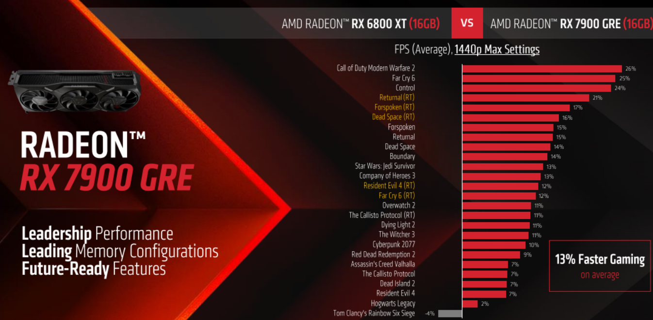 按照官方给出的性能数据,RX 7900 GRE相比于RX 6800 XT 2K游戏性能平均领先13%,最多可达26%,4K游戏性能领先幅度平均为8%,最多可达19%。
