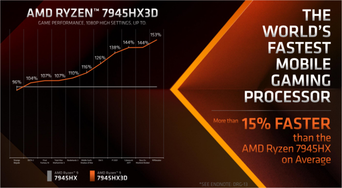 AMD官方表示,锐龙9 7945HX3D是世界上最快的移动游戏处理器,相较于锐龙9 7945HX,在包括《赛博朋克2077》《无主之地3》《F1 2021》《DOTA2》《最终幻想14》《尘埃5》等游戏(1080p,高画质)的测试中,锐龙9 7945HX3D的平均领先在15%以上。