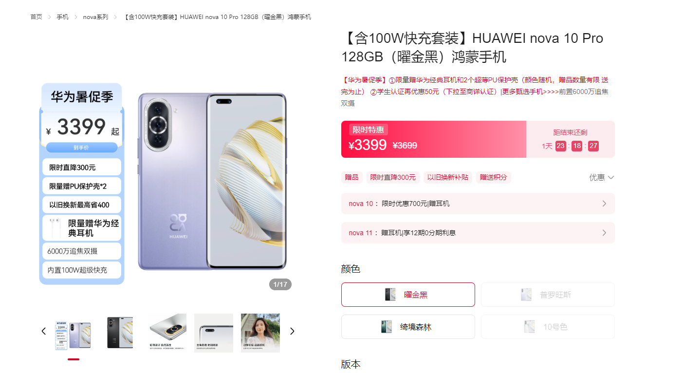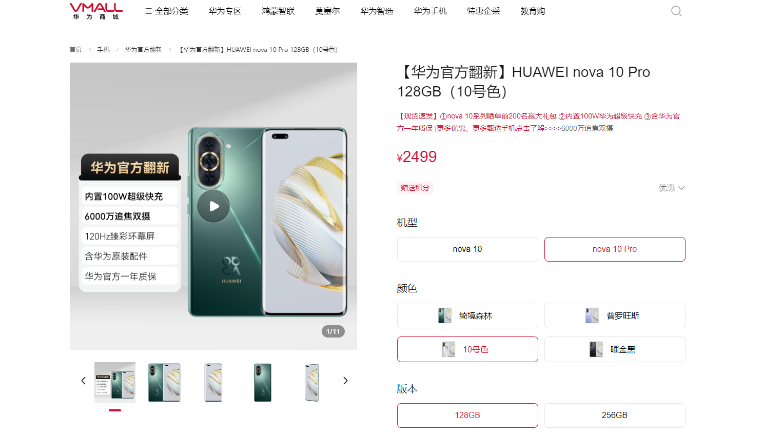 目前,华为nova 10 Pro官翻机提供128GB和256GB两种版本,售价分别为2499元和2799元,作为对比,华为nova 10 Pro全新机目前在华为商城限时优惠,128GB售价3399元、256GB售价3699元。