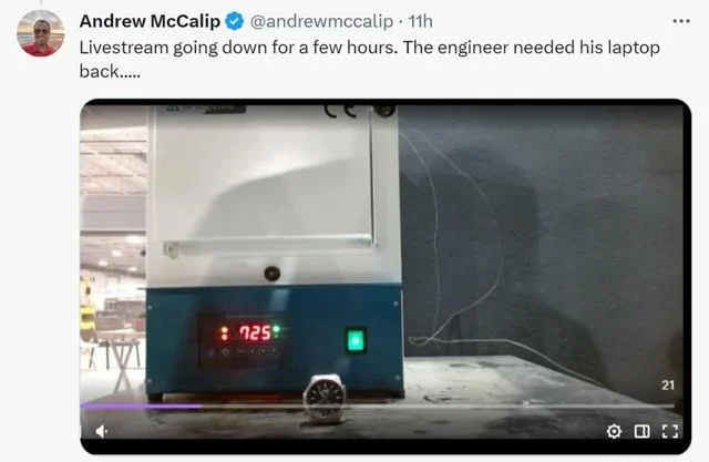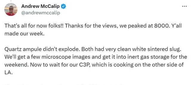 “Andrew McCalip”表示,结果看起来比较成功:石英瓶没有爆炸,有非常干净的白色烧结痕迹。