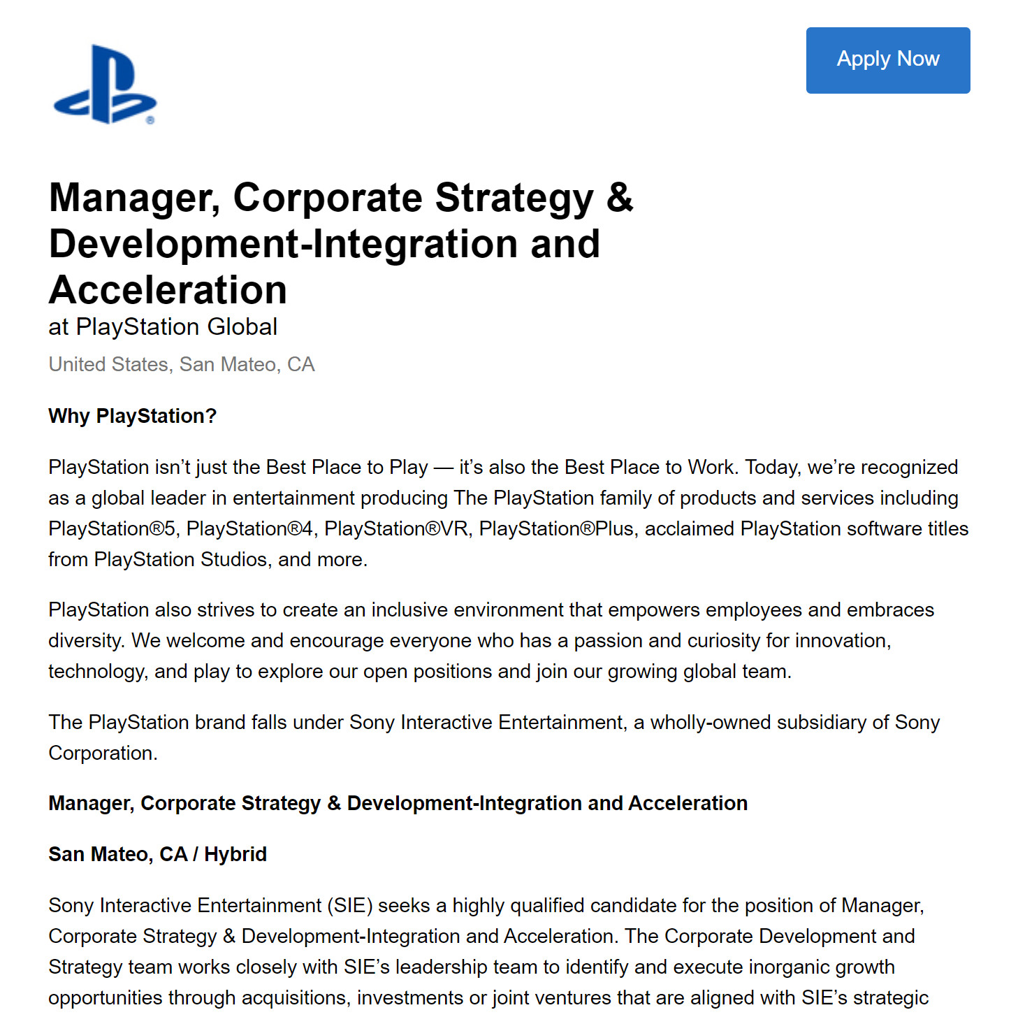 该工作描述中写道:“企业发展和战略团队与SIE的领导团队密切合作,通过收购、投资或合资,找到与SIE战略重点相一致的非有机增长机会,为公司创造重要的长期价值。”